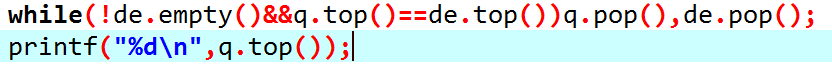 然后每次使用原队列前将队首与删除堆的队首比较,当完全相等时,我们就将两个队列都pop一下,就达到了删除元素的效果,而且不会超时(比隔壁单调队列好打多了)